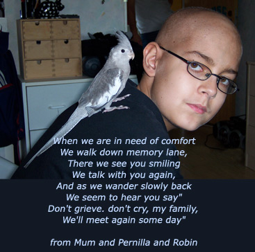 On 29 November Conny turned 17 years old and was slowly getting worse. He lost feeling in his right arm and sometimes leg and the pain in his head got worse until he finally had to be admitted to hospital in late February 2006. He got painkiller drugs pumped in to his body 24/7 and spent most of his time sleeping, but when he woke up he still had his great sense of humour and happy ways. The last thing he said to me when being "all there" was on 14 March (my birthday) when I was going back to the house for a while. I kissed him on the forehead and said "I'll be back soon. I love you." and he answered back to me "See ya, fatty!" and then he laughed and said "Only kidding".
