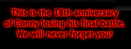 Well I wanted to write a little something about Conny for his page. Although I did not know him as many of the clan did, I knew of him and his struggles and know this horrible desease has robbed the world of an exceptional little boy... one who lived so exceptionally big... I watched my husband who was his friend shed tears many times over the course of Conny's battle. With every bit of good news was the bitter let down of the bad news that came soon thereafter, and was at times more than Steve could stand. And with every tear he shed for Conny I found myself shedding them as well... as a mother of three I watched his illness with prayers and sympathy for a child in pain and a family that I didn't even know.. that he would come through it.....I really believed that he would make it!