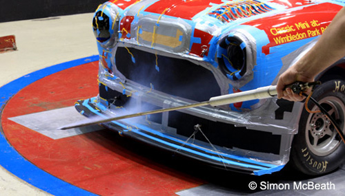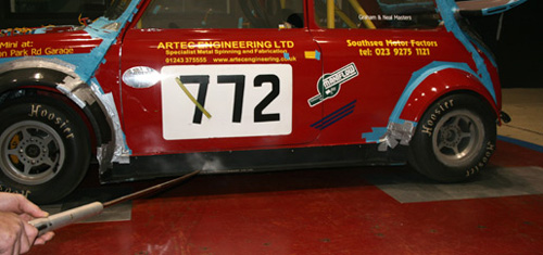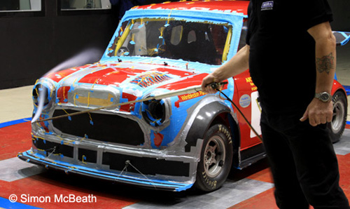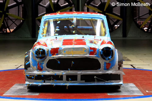 | The Mini normally races with flat headlamp infills, but our headlamp domes knocked 0.005 off the drag coeffient and unexpectedly, also produced downforce at the front end! So greater benefits were seen from having our headlamp domes than de-seaming the shell. |
